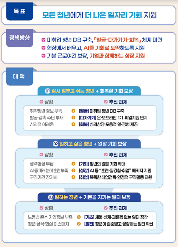 단순히 일자리를 제공하는 것을 넘어 잠시 멈춘 청년, 다시 도전하는 청년, 이미 일하고 있는 청년까지 모두를 포괄하며 실패를 허용하고 재도전을 응원하며 일터에서 존중받는 청년의 삶을 만들겠다는 취지를 담고 있습니다.